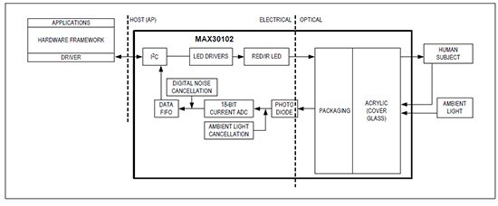 Figure 1: The MAX30102 from Maxim Integrated provides a highly integrated, single IC solution for driving the LEDs of an SpO2 unit, as well as digitizing its phototransistor output and providing a digital I/O port. (Image source: Maxim Integrated)
