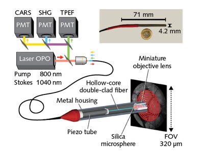 Figure 3: Using a hollow optical fiber to convey a laser beam to the site of interest and a piezo probe to steer it, this photonic “biopsy” technique could replace needle-based tests.4 (Image source: Institut Fresnel, via Laser Focus World)