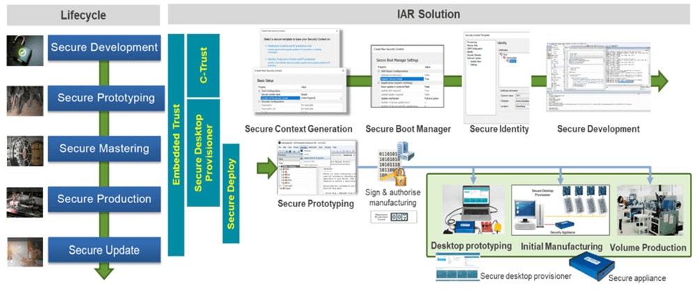 Working in the IAR Embedded Workbench, developers use the Secure Desktop Provisioner software tool to provision keys and firmware during preliminary prototyping stages. When the design is ready for initial manufacturing and volume production, firmware assets are transferred to manufacturing partners and development keys are replaced with secure production keys that are provisioned using a secure appliance.