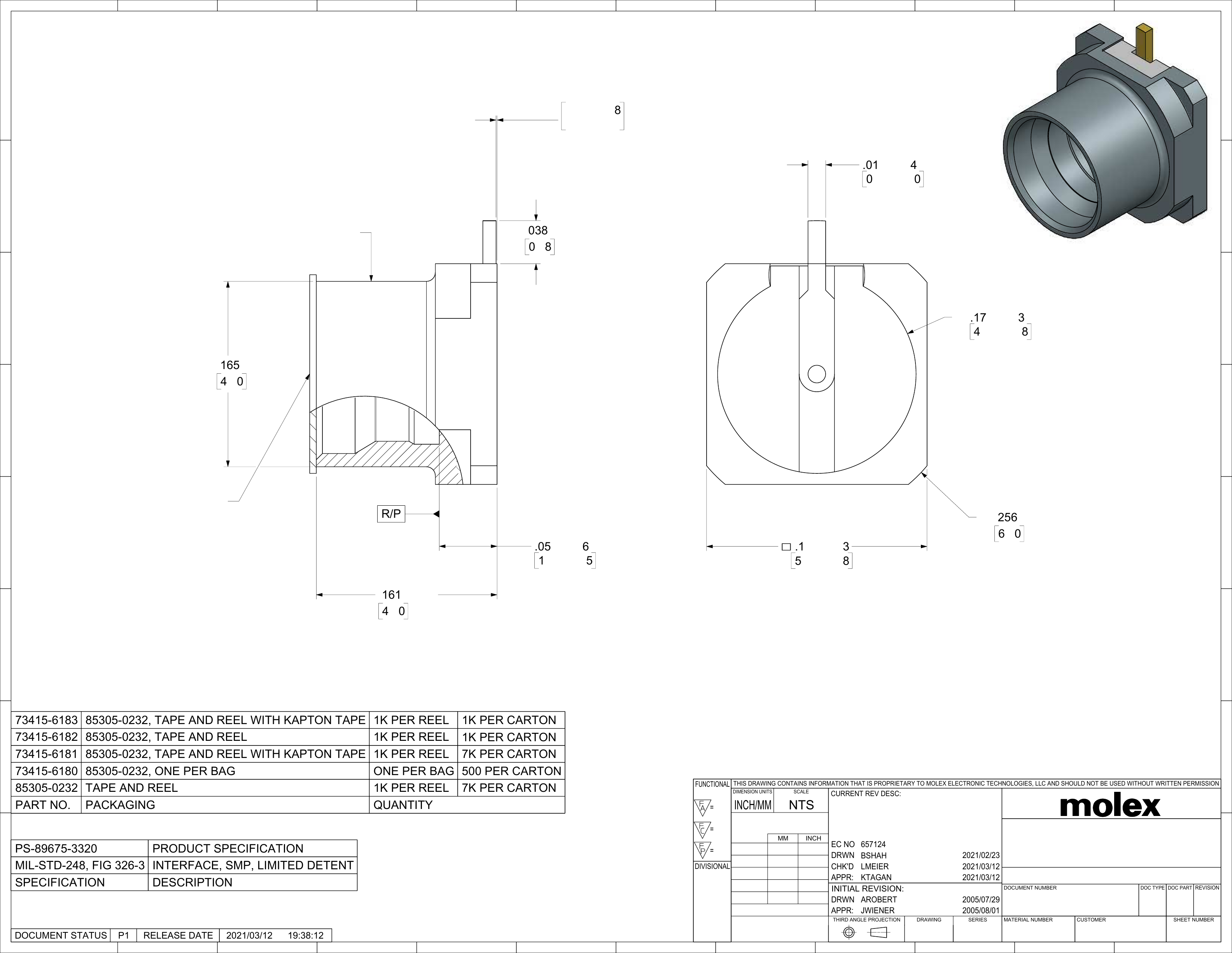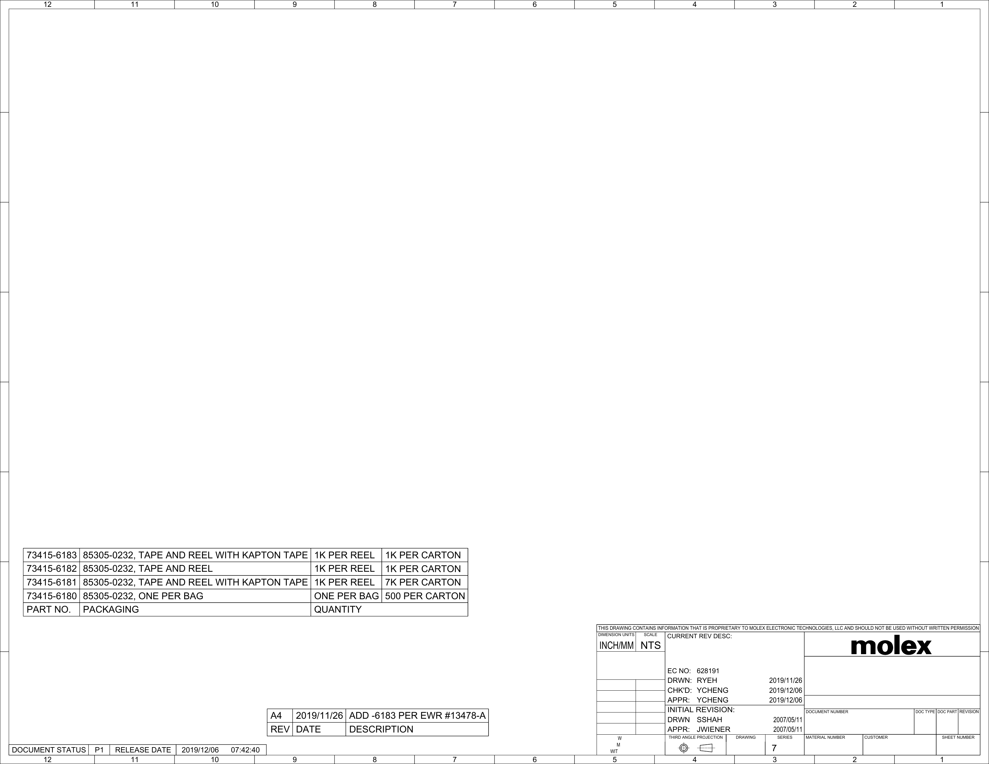 < 161="" 7="" »="" i4="" 0="" 73415—6183="" 85305-0232,="" tape="" and="" reel="" with="" kapton="" tape="" 1k="" per="" reel="" 1k="" per="" carton="" 73415—6182="" 85305-0232,="" tape="" and="" reel="" 1k="" per="" reel="" 1k="" per="" carton="" 73415-6181="" 85305-0232,="" tape="" and="" reel="" with="" kapton="" tape="" 1k="" per="" reel="" 7k="" per="" carton="" 73415—6180="" 85305-0232,="" one="" per="" bag="" one="" per="" bag="" 500="" per="" carton="" 85305-0232="" tape="" and="" reel="" 1k="" per="" reel="" 7k="" per="" carton="" functional="" this="" drawing="" contains="" information="" that="" is="" proprietaryto="" molex="" electronic="" technologies,="" llc="" and="" should="" not="" be="" used="" without="" written="" permission="" dimension="" units="" scale="" current="" rev="" desci="" part="" no.="" packaging="" quantity="" w:="" inch/mm="" nts="" molex="" fe:="" mm="" inch="" ec="" no="" 657124="" ps-89675-3320="" product="" specification="DRWN" bshah="" 2021/02/23="" mll-std-248,="" fig="" 326-3="" interface,="" 8mp,="" limited="" detent="" divisional="" chk‘d="" lmeier="" 2021/03/12="" appr:="" ktagan="" 2021/03/12="" specification="" description="" initial="" revision:="" document="" number="" doc="" type="" doc="" part="" revision="" drwn="" arobert="" 2005/07/29="" appr:="" jwiener="" 2005/08/01="" third="" angle="" projection="" drawing="" series="" material="" numeer="" customer="" sheet="" number="" document="" status="" p1="" release="" date="" 2021/03/12="" 19:38:12="" i="" g="">MATERIALS AND FINISHES: