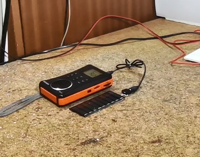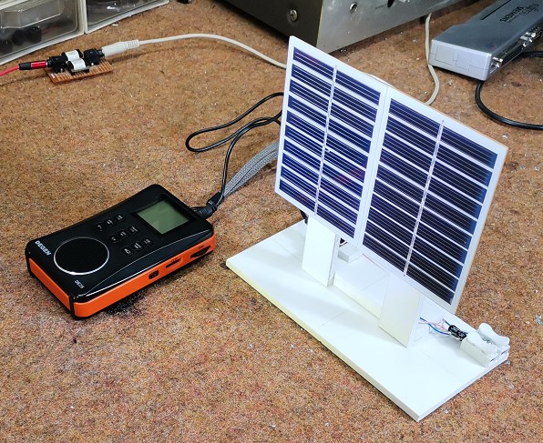 - The receiver is actually a solar cell, in my case two elements that generate 5 volts each connected in series, but this is not critical and any panel we have at hand can be used. The signal from the solar panel is fed to the Aux input of this small radio receiver through a 10-microfarad capacitor, whose function is to not pass the DC component of the signal. Otherwise, this radio in this case has the function of an audio amplifier. Now let's see how the device works in reality: First we turn on the transmitter and focus the output beam. An audio signal is brought to the input of the modulator, in my case from the sound card of the personal computer. On the side of the receiver, we turn on the radio, then we select the Aux input. The signal from the transmitter is emitted on the receiver. If we block the light beam, the transfer is interrupted.