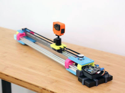 3D printed parts support two pieces of aluminum extrusion. A timing belt and pulley wheels are used to slide the carriage along the profile offering about 16 inches (40cm) of travel. A second motor is dedicated for panning offering a bit over 180 degrees.