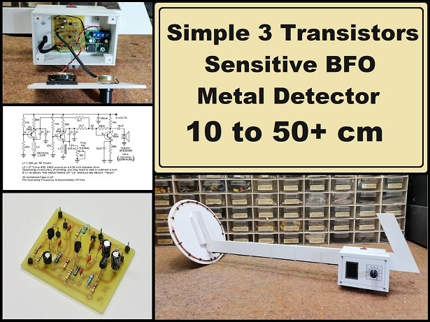 three transistors each, 4 capacitors, 2 resistors, a buzzer, etc... Let's first analyze the schematic diagrams of the three metal detectors. It is easy to see that the three schematics are identical. The only difference is the LED with current limiting transistor which is added in this circuit in parallel with the buzzer, which is added to one, but they do not affect the sensitivity at all.