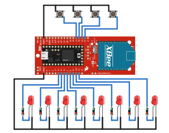- Checks for received data from the XBee. If a number 1-8 is received, the associated LED on pins 14-21 is illuminated. If any other character is received, all 8 LEDs are are switched off.