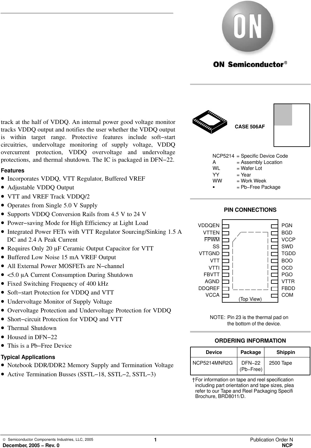 <5.0 ila="" current="" consumption="" during="" shutdown="" fixed="" switching="" frequency="" ot400="" khz="" soft—start="" protection="" for="" vddq="" and="" vtt="" undervoltage="" monitor="" of="" supply="" voltage="" overvollage="" protection="" and="" undervoltage="" protection="" for="" vddq="" shon—eireuit="" protection="" for="" vddq="" and="" vtl"="" thermal="" shutdown="" housed="" in="" dfn—22="" th'="" a="" pb—free="" device="" typical="" applications="" -="" notebook="" ddr/ddrz="" memory="" supply="" and="" termination="" voltage="" -="" active="" termination="" busses(sstl—18,="" sstl—2,="" sstl—3)="" m="" semtcnrtdtlctarcomponenlslndusltles="" ltc.2ao5="" 1="" december,="" 2005="" —="" rev.="" 0="" 0n="" semiconductor®="" case="" sugaf="" ncfszm="Specific" device="" code="" a="" e="" assembly="" location="" wl="" e="" water="" loi="" w="" e="" year="" ww="" e="" work="" week="" -="" e="" phefree="" package="" pin="" connections="" vddqen="" c.="" c="" pgn="" vtten="" :t="" —="" —="" —‘="" c="" seep="" ffwwi="" :i="" |="" i:="" 55="" :t="" k="" |="" c="" swo="" vtignd="" :t="" i="" |="" c="" tgdd="" vtt="" :l="" i="" |="" l:="" boo="" vtti="" :l="" i="" i="" l:="" 000="" fbvti="" :l="" i="" i="" l:="" pgo="" agnd="" :l="" i="" i="" l:="" v‘r'rn="" ddqref="" :l="" i______i="" l:="" fbdd="" vcca="" com="" 2'="" trap="" view)="" ':="" note.="" pin="" 23="" is="" the="" thermal="" pad="" on="" ihe="" bottom="" di="" the="" device,="" ordering="" information="" device="" package="" shippin="" ncpsmmnrze="" dfn722="" 250!)="" tape="" (pbefree)="" tfar="" intormation="" on="" tape="" and="" reel="" spectlicatlon="" including="" pan="" orientation="" and="" tape="" sizes.="" plea="" reter="" to="" our="" tape="" and="" reel="" packaging="" speeiii="" brochure,="" brdeolt/d.="" publication="" order="" n="" ncp="">5.0>© Semiconductor Components Industries, LLC, 2005